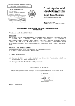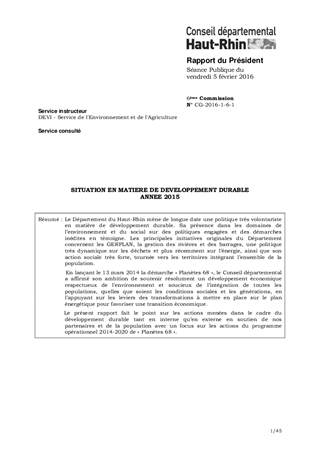Le Département du Haut-Rhin mène de longue date une politique très volontariste en matière de développement durable. Sa présence dans les domaines de l’environnement et du social sur des politiques engagées et des démarches inédites en témoigne. Les principales initiatives originales du Département concernent les GERPLAN, la gestion des rivières et des barrages, une politique très dynamique sur les déchets et plus récemment sur l’énergie, ainsi que son action sociale très forte, tournée vers les territoires intégrant l’ensemble de la population. En lançant le 13 mars 2014 la démarche « Planètes 68 », le Conseil départemental a affirmé son ambition de soutenir résolument un développement économique respectueux de l’environnement et soucieux de l’intégration de toutes les populations, quelles que soient les conditions sociales et les générations, en l’appuyant sur les leviers des transformations à mettre en place sur le plan énergétique pour favoriser une transition économique. Le présent rapport fait le point sur les actions menées dans le cadre du développement durable tant en interne qu’en externe en soutien de nos partenaires et de la population avec un focus sur les actions du programme opérationnel 2014-2020 de « Planètes 68 ».
