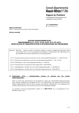 Résumé : Dans le cadre du présent rapport et selon le règlement financier dans son article 9.6, il vous est proposé de procéder à l’ajustement des affectations et des désaffectations par opération sur les programmes : - A111 "Constructions neuves et travaux sur les routes départementales" (- 1 005 475 €), - A131 "Travaux de renforcement sur les routes départementales" (+ 104 112 €), - A132 "Calibrage sur les routes départementales" (- 6 846 €), - A134 "Construction et rénovation d’ouvrages d’art" (300 000 €), - A171 "Aménagement cyclable sur les routes départementales" (- 166 802 €), - A472 "Aménagement cyclable hors du domaine départemental" (-298 899 €).