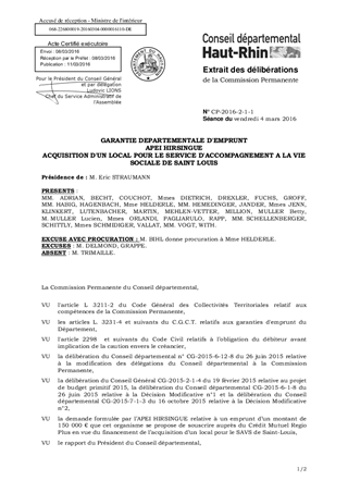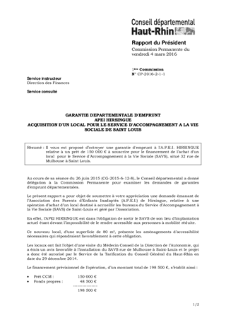 GARANTIE DEPARTEMENTALE D'EMPRUNT APEI HIRSINGUE ACQUISITION D'UN LOCAL POUR LE SERVICE D'ACCOMPAGNEMENT A LA VIE SOCIALE DE SAINT LOUIS