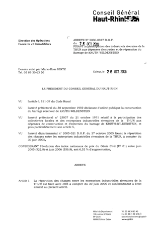 fixant la participation des industriels riverains de la Thur aux dépenses d'entretien et de réparation du barrage de Kruth-Wildenstein. Resumé Pièces jointes ARRETE Assemblée : Non défini Date : 26/10/2006 Rapporteur : Non défini Collectivité : Conseil départemental du Haut-Rhin Direction : Non défini Service : Service du Patrimoine et du droit des Sols Domaine : Barrages Commission :