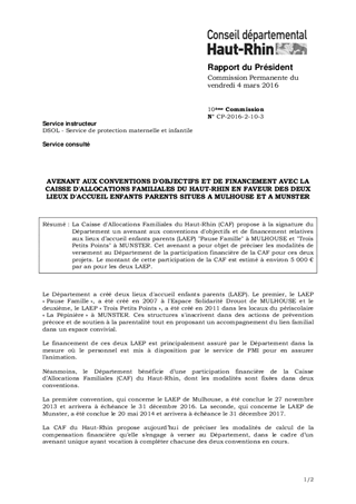 La Caisse d'Allocations Familiales du Haut-Rhin (CAF) propose à la signature du Département un avenant aux conventions d'objectifs et de financement relatives aux lieux d’accueil enfants parents (LAEP) "Pause Famille" à MULHOUSE et "Trois Petits Points" à MUNSTER. Cet avenant a pour objet de préciser les modalités de versement au Département de la participation financière de la CAF pour ces deux projets. Le montant de cette participation de la CAF est estimé à environ 5 000 € par an pour les deux LAEP.