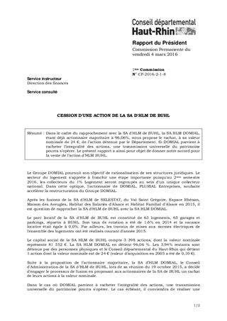 Dans le cadre du rapprochement avec la SA d'HLM de BUHL, la SA HLM DOMIAL, étant déjà actionnaire majoritaire à 96,06%, nous propose le rachat, à sa valeur nominale de 24 €, de l’action détenue par le Département. Si DOMIAL parvient à racheter l’integralité des actions, une transmission universelle du patrimoine pourra s’opérer. Le présent rapport a ainsi pour objet de donner notre accord pour la vente de l’action d’HLM BUHL.