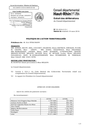I) Le budget primitif de l’action territorialisée traduit encore en 2016 la forte présence du Département aux côtés des partenaires locaux, communes et établissements publics de coopération intercommunale. Dans un contexte où les Départements se doivent d’optimiser au mieux l’utilisation de leurs ressources budgétaires, le Département du Haut-Rhin devra, tout en honorant les engagements pris antérieurement auprès de ses partenaires, redéfinir sa politique d’appui aux territoires. Pour 2016, le budget primitif de l’action territorialisée s’établit ainsi à 14 809 285 € de crédits en investissement, et 2 848 144 € de crédits en fonctionnement. Les nouveaux engagements dans le domaine des projets d’intérêt local se traduisent quant à eux par la création d’une autorisation de programme de 1 517 324 €. II) Est également proposée la modification par voie d'avenant de deux Contrats de Territoires de Vie pour ajuster les enveloppes "GERPLAN" et "électrification"