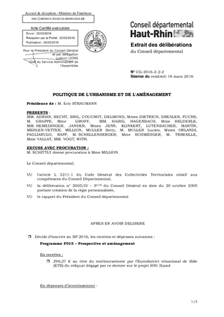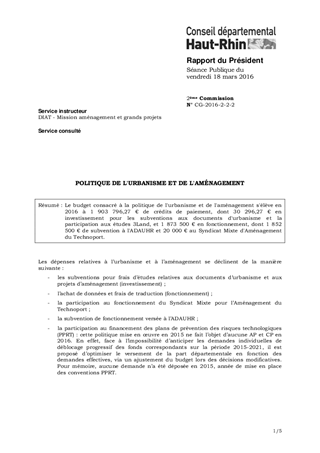 Le budget consacré à la politique de l'urbanisme et de l'aménagement s'élève en 2016 à 1 903 796,27 € de crédits de paiement, dont 30 296,27 € en investissement pour les subventions aux documents d'urbanisme et la participation aux études 3Land, et 1 873 500 € en fonctionnement, dont 1 852 500 € de subvention à l'ADAUHR et 20 000 € au Syndicat Mixte d'Aménagement du Technoport.