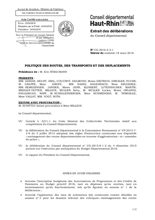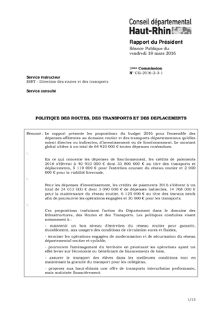 Le rapport présente les propositions du budget 2016 pour l’ensemble des dépenses afférentes au domaine routier et des transports départementaux qu’elles soient directes ou indirectes, d’investissement ou de fonctionnement. Le montant global s'élève à un total de 64 923 000 € toutes dépenses confondues. En ce qui concerne les dépenses de fonctionnement, les crédits de paiements 2016 s’élèvent à 40 910 000 € dont 33 800 000 € au titre des transports et déplacements, 5 110 000 € pour l’entretien courant du réseau routier et 2 000 000 € pour la viabilité hivernale. Pour les dépenses d’investissement, les crédits de paiements 2016 s’élèvent à un total de 24 013 000 € dont 3 090 000 € de dépenses indirectes, 14 768 000 € pour la maintenance du réseau routier, 6 125 000 € au titre des travaux neufs afin de poursuivre les opérations engagées et 30 000 € pour les transports. Ces propositions traduisent l’action du Département dans le domaine des Infrastructures, des Routes et des Transports. Les politiques conduites visent notamment à : - maintenir un bon niveau d’entretien du réseau routier pour garantir, durablement, aux usagers des conditions de circulation sures et fluides, - terminer les opérations engagées de modernisation et de sécurisation du réseau départemental routier et cyclable, - poursuivre l’aménagement du territoire en priorisant les opérations ayant un effet levier sur l’économie ou bénéficiant de financements de tiers, - assurer le transport des élèves dans les meilleures conditions tout en maintenant la gratuité du transport pour les collégiens, - proposer aux haut-rhinois une offre de transports interurbains performante, mais maitrisée financièrement.
