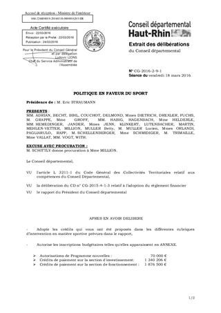 Ce budget exprime le maintien de notre effort en faveur du sport pour tous et des associations sportives, facteur de lien social et de dynamisme dans nos territoires. Il s’élève pour la section d’investissement à 70 000 € en autorisations de programme et 1 340 206 € en crédits de paiement à destination des communes (fin du dispositif Guide des Aides) et des associations. D’autres projets sportifs structurants ainsi que les projets sportifs d’intérêt local sont intégrés dans les CTV 2014-2019 pour un montant prévisionnel d’autorisations de programme de 17 017 558 €. Le budget s’élève pour la section de fonctionnement à 1 876 500 € en crédits de paiement pour soutenir le développement des disciplines sportives et des clubs, l’organisation de manifestations et évènements sportifs, ainsi que le sport scolaire. Au total, il vous est proposé d’allouer un montant total de 70 000 € en autorisations de programme et de 3 216 706 € en crédits de paiement en faveur du sport.