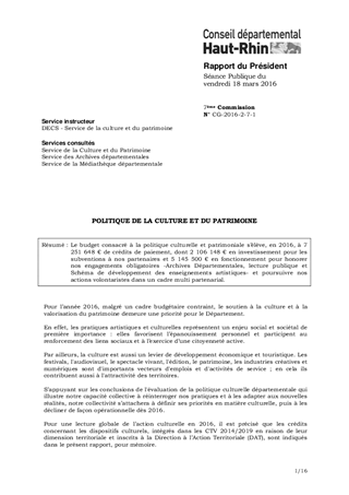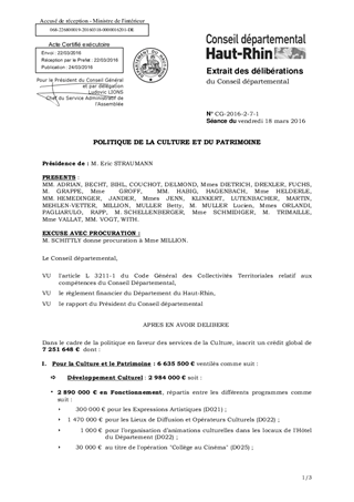 Le budget consacré à la politique culturelle et patrimoniale s’élève, en 2016, à 7 251 648 € de crédits de paiement, dont 2 106 148 € en investissement pour les subventions à nos partenaires et 5 145 500 € en fonctionnement pour honorer nos engagements obligatoires -Archives Départementales, lecture publique et Schéma de développement des enseignements artistiques- et poursuivre nos actions volontaristes dans un cadre multi partenarial.