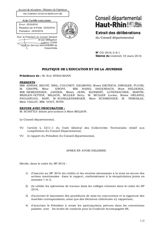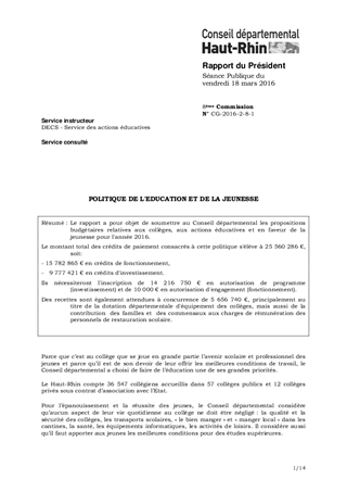 Le rapport a pour objet de soumettre au Conseil départemental les propositions budgétaires relatives aux collèges, aux actions éducatives et en faveur de la jeunesse pour l'année 2016. Le montant total des crédits de paiement consacrés à cette politique s'élève à 25 560 286 €, soit: - 15 782 865 € en crédits de fonctionnement, - 9 777 421 € en crédits d'investissement. Ils nécessiteront l'inscription de 14 216 750 € en autorisation de programme (investissement) et de 10 000 € en autorisation d'engagement (fonctionnement). Des recettes sont également attendues à concurrence de 5 656 740 €, principalement au titre de la dotation départementale d'équipement des collèges, mais aussi de la contribution des familles et des commensaux aux charges de rémunération des personnels de restauration scolaire.