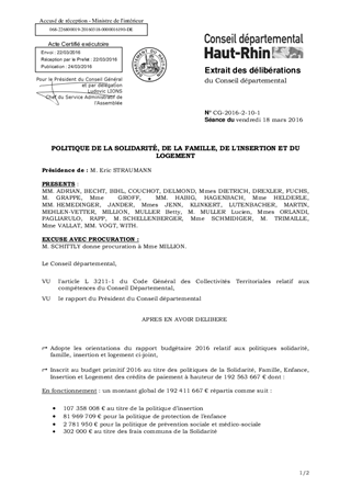 L’année 2016 sera marquée par des enjeux forts. Les politiques Famille, Insertion et Logement, en interaction, constituent un enjeu majeur pour le Département, appelant un plan d’action stratégique, une amélioration continue du pilotage et des réponses innovantes. L’accompagnement des familles dans toutes leurs composantes reste une mission prioritaire nécessitant un partenariat nourri et construit, de la cohérence et de la proximité territoriale avec les usagers. La politique insertion et rSa est le premier poste budgétaire de la Solidarité. Tenant compte de son impact prépondérant avec un reste à charge conséquent (près de 50 M€), la collectivité s’est engagée en 2016 à activer un ensemble de leviers en : - appliquant le « juste droit », - renforçant les dispositifs d'accompagnement et initiant des expérimentations mobilisant les acteurs d’un territoire et en mettant l’accent sur le pouvoir d’agir citoyen, - prenant ses responsabilités par des actions novatrices, plaçant le bénéficiaire du rSa dans un cercle vertueux par le biais du bénévolat, comme porte vers le changement et le retour à l’emploi. Sur le plan budgétaire, le BP 2016 d’un montant de 192,6 M€ est en baisse, pour les dépenses de fonctionnement, de 1,4 M€ soit -0,7 % par rapport au BP 2015. S'agissant du RSA, le montant inscrit correspond à la dépense réelle 2014 soit 90,3 M€.