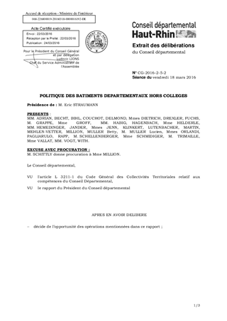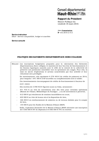 Les inscriptions budgétaires proposées pour la valorisation des bâtiments départementaux (hors collèges), le maintien de leur bon état de fonctionnement et les besoins logistiques associés sont le reflet de la volonté de la collectivité de préserver son patrimoine immobilier tout en optimisant ses usages. Pour cela, la mise en œuvre d’opérations et actions caractérisées par leur sobriété et leur robustesse sera privilégiée. En investissement, cela représente 6 578 400 € de crédits de paiement en 2016, pour lesquels 1 641 500 € d’AP nouvelles ou complémentaires sont à valider. Ces investissements s’accompagnent de crédits de fonctionnement à hauteur de 8 871 400 €. Des recettes de 2 396 933 € figurent aussi au bilan, notamment : - 671 933 € au titre de conventions avec des tiers pour certaines opérations (Maison de l’Alsace, Médiathèque du Sundgau …) ou de subventions à percevoir, - 612 000 € qui résulteront de cessions immobilières en cours, - 632 000 € au titre de locaux mis à la disposition de tiers, - 326 000 € en remboursement de sinistres ou de travaux réalisés pour le compte de tiers, - 155 000 € pour les fluides de la Maison d’Alsace (MAP). Enfin, l’opération financière de la Maison d’Alsace (MAP) nécessite une inscription de 5 050 000 € HT en dépenses et 6 060 000 € TTC en recettes.