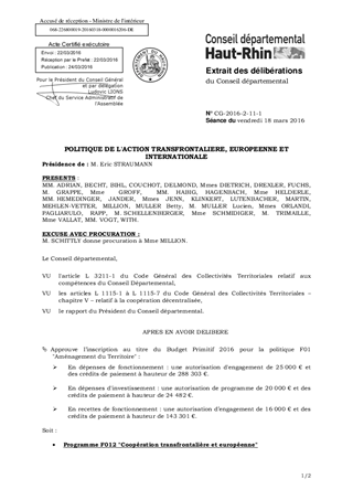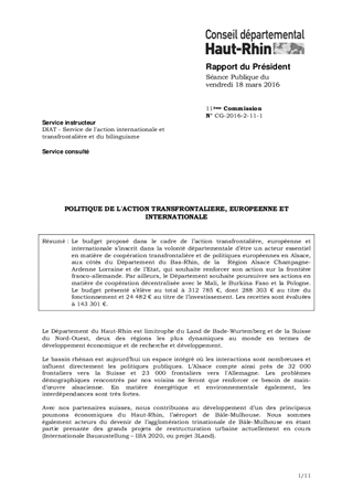 Le budget proposé dans le cadre de l’action transfrontalière, européenne et internationale s’inscrit dans la volonté départementale d’être un acteur essentiel en matière de coopération transfrontalière et de politiques européennes en Alsace, aux côtés du Département du Bas-Rhin, de la Région Alsace Champagne-Ardenne Lorraine et de l’Etat, qui souhaite renforcer son action sur la frontière franco-allemande. Par ailleurs, le Département souhaite poursuivre ses actions en matière de coopération décentralisée avec le Mali, le Burkina Faso et la Pologne. Le budget présenté s’élève au total à 312 785 €, dont 288 303 € au titre du fonctionnement et 24 482 € au titre de l’investissement. Les recettes sont évaluées à 143 301 €.
