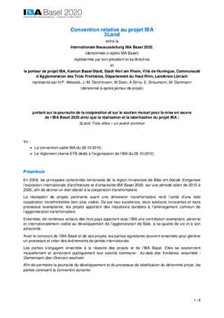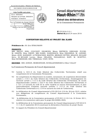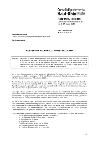 Le projet 3Land d'aménagement d'un quartier trinational le long du Rhin, à cheval sur les villes de Bâle, Huningue et Weil-am-Rhein, devrait être labellisé par l'IBA 2020 le 14 avril 2016. Le présent rapport a pour objet la signature par le Département de la convention entre les partenaires du projet 3Land dont il fait partie, et l'IBA BASEL 2020 en vue de cette labellisation.