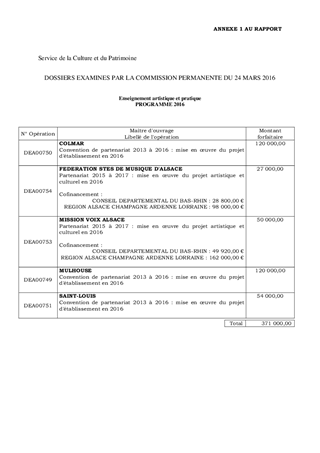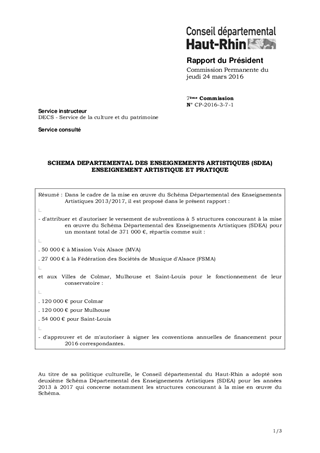 Dans le cadre de la mise en œuvre du Schéma Départemental des Enseignements Artistiques 2013/2017, il est proposé dans le présent rapport : - d'attribuer et d'autoriser le versement de subventions à 5 structures concourant à la mise en œuvre du Schéma Départemental des Enseignements Artistiques (SDEA) pour un montant total de 371 000 €, répartis comme suit : . 50 000 € à Mission Voix Alsace (MVA) . 27 000 € à la Fédération des Sociétés de Musique d'Alsace (FSMA) et aux Villes de Colmar, Mulhouse et Saint-Louis pour le fonctionnement de leur conservatoire : . 120 000 € pour Colmar . 120 000 € pour Mulhouse . 54 000 € pour Saint-Louis - d'approuver et de m'autoriser à signer les conventions annuelles de financement pour 2016 correspondantes.