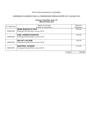 L'article L 121-1 du Code Rural et de la Pêche Maritime définit les échanges d'immeubles ruraux comme un mode d'aménagement foncier. Le Département peut participer au financement de ces échanges (frais de notaire et de géomètre). La participation départementale est versée aux particuliers après avis favorable de la Commission Départementale d'Aménagement Foncier (CDAF). Le tableau joint en annexe présente 4 bénéficiaires pour deux dossiers ayant recueilli l'avis favorable de la CDAF et de la Commission de l'Agriculture, de l'Environnement, du Cadre de Vie et de la Montagne. L'aide totale qu'il vous est proposé d'affecter s'élève à 642 €.