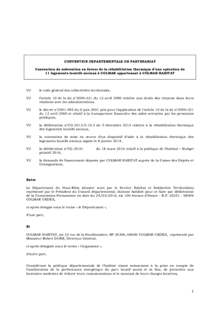 Dans le cadre de la politique départementale de l’habitat et de la démarche « transition énergétique de la Haute-Alsace », le Département soutient la rénovation thermique des logements du parc social. A ce titre, il vous est proposé d’accorder à COLMAR HABITAT une subvention départementale de 29 150 € pour 11 logements, situés 30 et 32 rue Billing à COLMAR. Il est proposé la signature d’une convention fixant notamment le montant de la subvention départementale et ses modalités de versement.