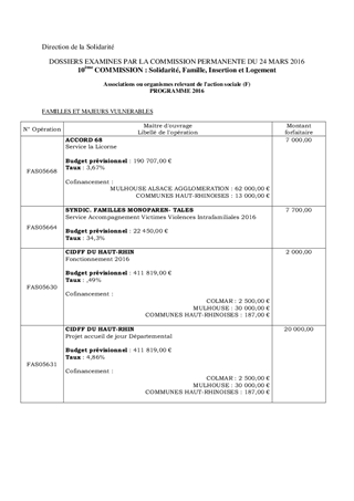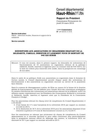 Il vous est soumis, dans le présent rapport, les demandes de subventions de fonctionnement de 33 associations ou organismes relevant de la politique solidarité, famille, insertion et logement pour un montant total de 945 520 €, sur la base de critères plus restrictifs cette année, dans la perspective du recentrage de nos aides.
