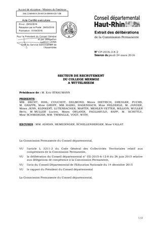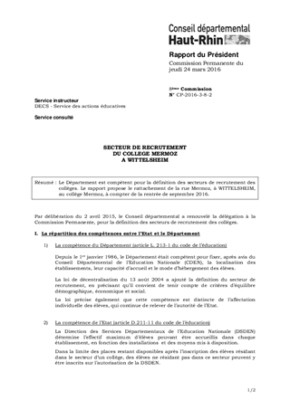 Le Département est compétent pour la définition des secteurs de recrutement des collèges. Le rapport propose le rattachement de la rue Mermoz, à WITTELSHEIM, au collège Mermoz, à compter de la rentrée de septembre 2016.