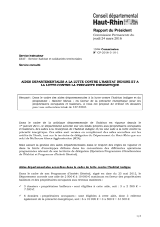 Dans le cadre des aides départementales à la lutte contre l’habitat indigne et du programme « Habiter Mieux » en faveur de la précarité énergétique pour les propriétaires occupants et bailleurs, il vous est proposé de retenir 56 dossiers pour une subvention totale de 137 350 €.
