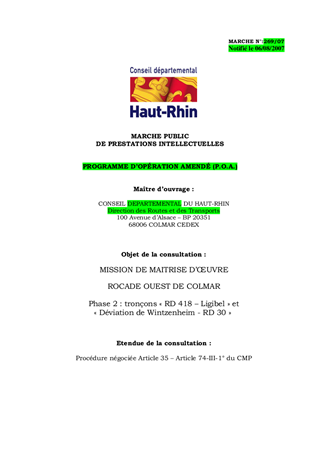 Le présent rapport propose d’approuver les études préliminaires, le bilan de la concertation des études préliminaires et le choix des variantes à étudier, de fixer l’enveloppe financière prévisionnelle de la phase 2 de la Rocade Ouest de Colmar au montant de 35 M€ TTC (valeur février 2006) ainsi que d'amender le programme.