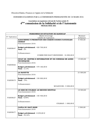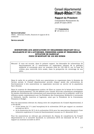 Il vous est soumis, dans le présent rapport, les demandes de subventions de fonctionnement de 11 associations ou organismes relevant de la politique solidarité et autonomie pour un montant total de 102 850 €, sur la base de critères plus restrictifs cette année, dans la perspective du recentrage de nos aides.