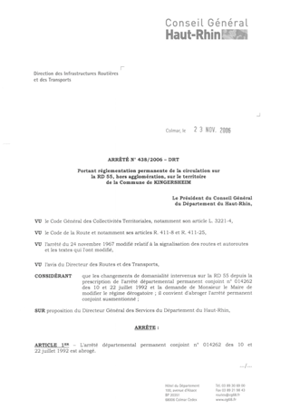 portant réglementation permanente de la circulation sur la RD 55, hors agglomération, sur le territoire de la commune de KINGERSHEIM. Resumé Pièces jointes ARRETE Assemblée : Non défini Date : 23/11/2006 Rapporteur : Non défini Collectivité : Conseil départemental du Haut-Rhin Direction : Non défini Service : Direction des Routes Domaine : Circulation Commission :