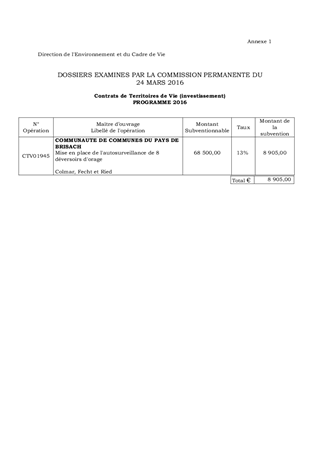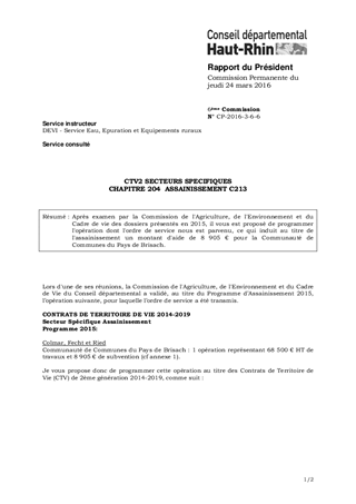 Après examen par la Commission de l'Agriculture, de l'Environnement et du Cadre de vie des dossiers présentés en 2015, il vous est proposé de programmer l'opération dont l'ordre de service nous est parvenu, ce qui induit au titre de l'assainissement un montant d'aide de 8 905 € pour la Communauté de Communes du Pays de Brisach.