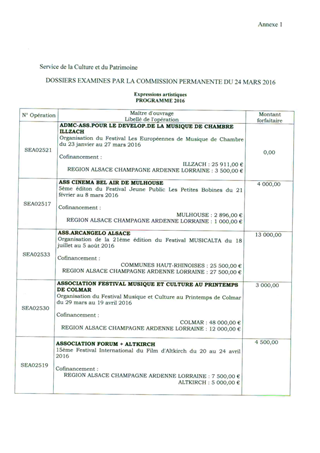 Au titre de sa politique culturelle, le Conseil départemental a adopté différents dispositifs permettant de soutenir diverses composantes du secteur culturel : expressions artistiques, lieux de diffusion et opérateurs culturels, animation du patrimoine et musées. Il est proposé, dans le présent rapport : I. Expressions artistiques - d’attribuer et d'autoriser le versement de subventions de fonctionnement pour un montant total de 98 250 € à 16 associations pour des aides aux projets ; II. Lieux de diffusion et opérateurs culturels" - d’attribuer et d'autoriser le versement de subventions pour un montant total de 740 400 €, dont 490 400 € et 90 000 € (fonctionnement et investissement) en faveur des Dominicains de Guebwiller et 160 000 € (fonctionnement) en faveur de la Filature de Mulhouse ; III. Animation du patrimoine et musées - d’attribuer et d'autoriser le versement de subventions pour un montant total de 85 500 € dont : 75 000 € (fonctionnement) en faveur de l’Association Propriétaire du Musée de l’Automobile de Mulhouse ; 10 500 € (fonctionnement) en faveur de 2 associations oeuvrant pour le patrimoine. - d'acter la poursuite d'un partenariat portant sur le plan de formation à destination des personnels des musées d’Alsace. - d'approuver et de m'autoriser à signer les conventions et avenants correspondants.