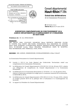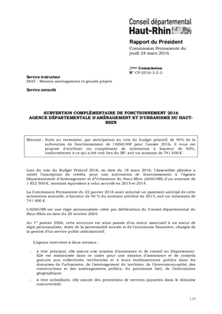 SUBVENTION COMPLÉMENTAIRE DE FONCTIONNEMENT 2016 AGENCE DÉPARTEMENTALE D'AMÉNAGEMENT ET D'URBANISME DU HAUT-RHIN