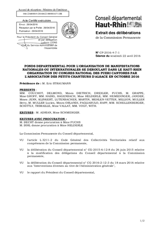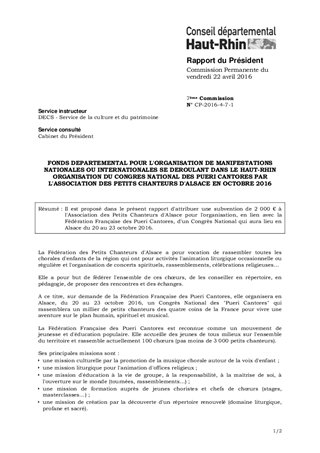 FONDS DEPARTEMENTAL POUR L'ORGANISATION DE MANIFESTATIONS NATIONALES OU INTERNATIONALES SE DEROULANT DANS LE HAUT-RHIN ORGANISATION DU CONGRES NATIONAL DES PUERI CANTORES PAR L'ASSOCIATION DES PETITS CHANTEURS D'ALSACE EN OCTOBRE 2016