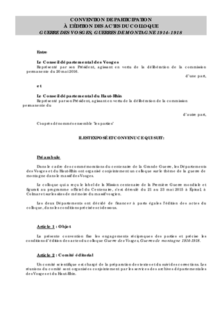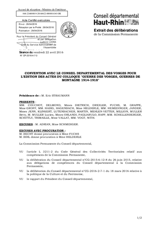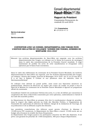 Les archives départementales du Haut-Rhin ont organisé, avec les archives départementales des Vosges, un colloque sur le thème de la guerre de montagne dans le cadre des commémorations de la Première Guerre mondiale. Il s’agit maintenant de publier les actes de cette manifestation et d’organiser cette opération par le biais d’une convention.