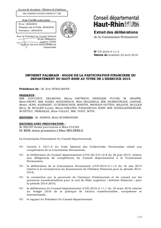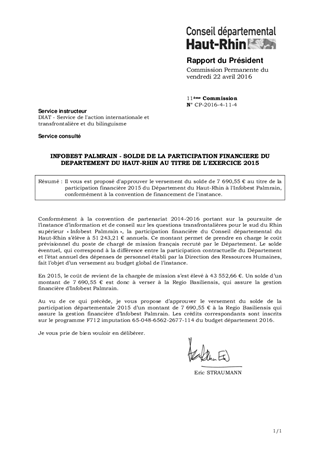 INFOBEST PALMRAIN - SOLDE DE LA PARTICIPATION FINANCIERE DU DEPARTEMENT DU HAUT-RHIN AU TITRE DE L'EXERCICE 2015