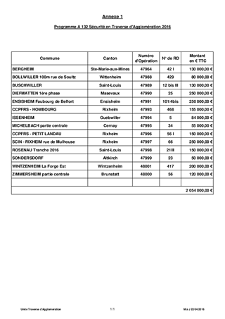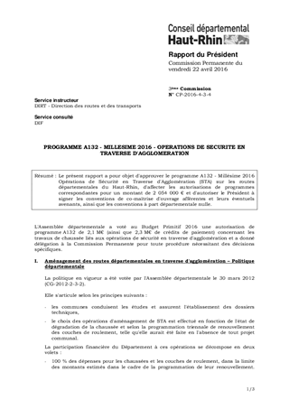 Le présent rapport a pour objet d'approuver le programme A132 - Millésime 2016 Opérations de Sécurité en Traverse d'Agglomération (STA) sur les routes départementales du Haut-Rhin, d'affecter les autorisations de programmes correspondantes pour un montant de 2 054 000 € et d'autoriser le Président à signer les conventions de co-maîtrise d'ouvrage afférentes et leurs éventuels avenants, ainsi que les conventions à part départementale nulle.