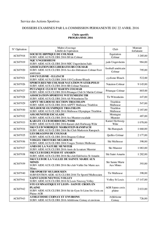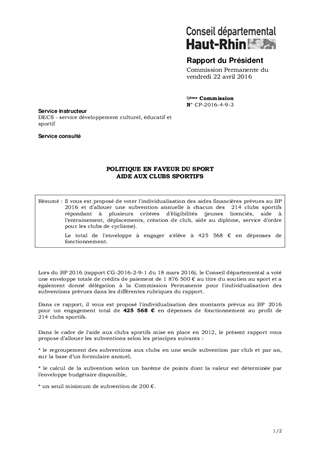 Il vous est proposé de voter l'individualisation des aides financières prévues au BP 2016 et d’allouer une subvention annuelle à chacun des 214 clubs sportifs répondant à plusieurs critères d’éligibilités (jeunes licenciés, aide à l’entrainement, déplacements, création de club, aide au diplôme, service d’ordre pour les clubs de cyclisme). Le total de l'enveloppe à engager s'élève à 425 568 € en dépenses de fonctionnement.