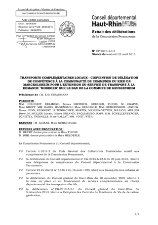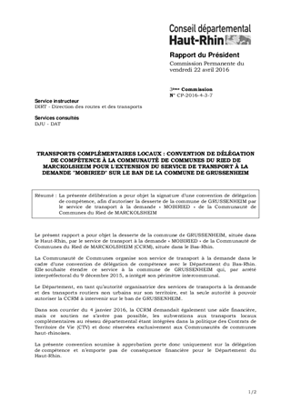 La présente délibération a pour objet la signature d’une convention de délégation de compétence, afin d'autoriser la desserte de la commune de GRUSSENHEIM par le service de transport à la demande « MOBIRIED » de la Communauté de Communes du Ried de MARCKOLSHEIM