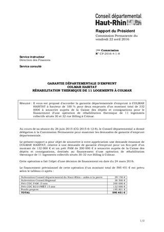 GARANTIE DÉPARTEMENTALE D'EMPRUNTCOLMAR HABITATRÉHABILITATION THERMIQUE DE 11 LOGEMENTS À COLMAR