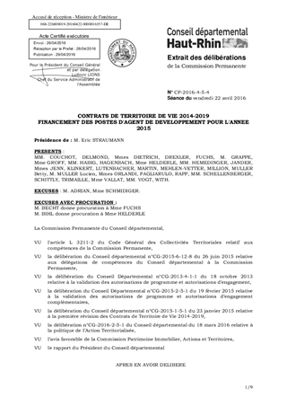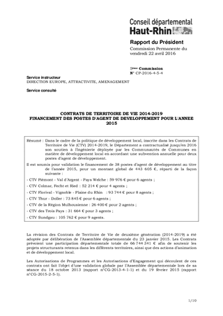 Dans le cadre de la politique de développement local, inscrite dans les Contrats de Territoire de Vie (CTV) 2014-2019, le Département a contractualisé jusqu’en 2016 son soutien à l’ingénierie déployée par les Communautés de Communes en matière de développement local en accordant une subvention annuelle pour deux postes d’agent de développement. Il est soumis pour validation le financement de 38 postes d’agent de développement au titre de l’année 2015, pour un montant global de 443 605 €, réparti de la façon suivante : - CTV Piémont - Val d’Argent - Pays Welche : 59 976 € pour 6 agents ; - CTV Colmar, Fecht et Ried : 52 214 € pour 4 agents ; - CTV Florival - Vignoble - Plaine du Rhin : 93 744 € pour 8 agents ; - CTV Thur - Doller : 73 845 € pour 6 agents ; - CTV de la Région Mulhousienne : 26 400 € pour 2 agents ; - CTV des Trois Pays : 31 664 € pour 3 agents ; - CTV Sundgau : 105 762 € pour 9 agents.