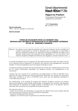 Ce rapport a pour objet de présenter des mesures d'urgence visant à modifier les critères d'intervention du Fonds de Solidarité pour le Logement du Haut-Rhin, afin d'en optimiser la gestion, au regard de la situation financière du fonds et du contexte social actuel. Ces mesures seront applicables au 1er mai 2016. Une révision complète du Règlement Intérieur sera engagée au second trimestre 2016.