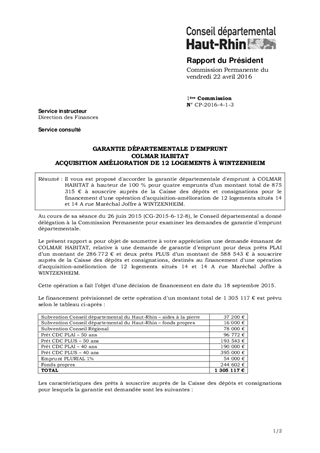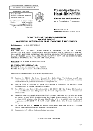 GARANTIE DÉPARTEMENTALE D'EMPRUNTCOLMAR HABITATACQUISITION AMÉLIORATION DE 12 LOGEMENTS À WINTZENHEIM
