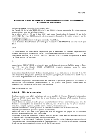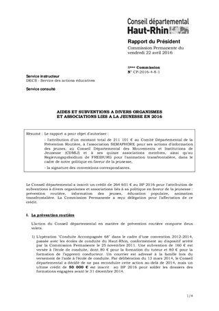 Le rapport a pour objet d'autoriser : - l'attribution d'un montant total de 211 101 € au Comité Départemental de la Prévention Routière, à l'association SEMAPHORE pour ses actions d'information des jeunes, au Conseil Départemental des Mouvements et Institutions de Jeunesse (CDMIJ) et à ses quinze associations membres, ainsi qu'au Regierungspräsidium de FREIBURG pour l'animation transfrontalière, dans le cadre de notre politique en faveur de la jeunesse, - la signature des conventions correspondantes.