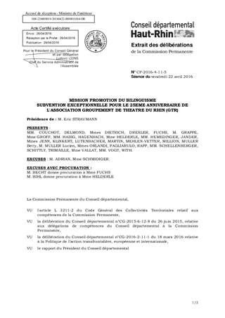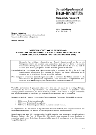 La politique volontariste du Conseil départemental en faveur du bilinguisme inclut un soutien aux associations qui œuvrent dans ce domaine. L'association Groupement de Théâtre du Rhin (GTR) fédère du nord au sud de l'Alsace près de 300 groupes de théâtre dialectal (jeunes et adultes). L'association fête cette année son 25ème anniversaire et organise, les 23 et 24 avril, une manifestation réunissant des groupes de théâtre, de danse folklorique et de musique qui se produiront devant un public régional. Pour marquer le soutien du Conseil départemental à la pérennité du théâtre alsacien et à la transmission du patrimoine linguistique, une subvention exceptionnelle d'un montant de 1 000 € est proposée dans le cadre de cette délibération.