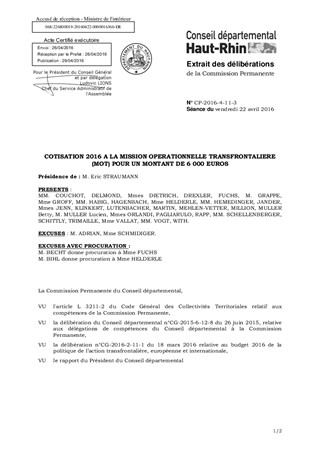 Il est proposé que le Département s'acquitte de la cotisation annuelle 2016 auprès de la Mission Opérationnelle Transfrontalière pour un montant de 6 000 euros. La MOT est une association menant des opérations de coopération transfrontalière. Elle apporte, entre autres, une expertise et une veille sur la plupart des projets transfrontaliers.