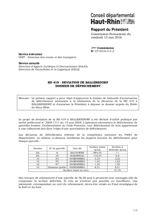 Le présent rapport a pour objet d'approuver le dossier de demande d'autorisation de défrichement nécessaire à la réalisation de la déviation de la RD 419 à BALLERSDORF et d'autoriser le Président à déposer ce dossier auprès du Préfet du Haut-Rhin.