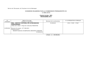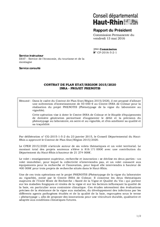 Dans le cadre du Contrat de Plan Etat/Région 2015/2020, il est proposé d’allouer une subvention d’investissement de 50 000 € au Centre INRA de Colmar pour la réalisation du projet PHENOTIS (Phénotypage de la vigne du laboratoire au vignoble). Cette opération vise à doter le Centre INRA de Colmar et le Biopôle d’équipements de dernière génération permettant d’augmenter le débit et la précision du phénotypage au laboratoire, en serre et au vignoble, et d’en améliorer sa qualité et sa traçabilité.