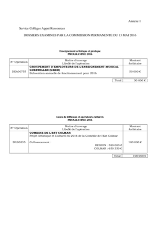 Au titre de sa politique culturelle, le Conseil départemental a adopté différents dispositifs permettant de soutenir diverses composantes du secteur culturel dont l'enseignement artistique et pratique (schéma départemental des enseignements artistiques), ainsi que les lieux de diffusion et opérateurs culturels. A ce titre, il est proposé, dans le présent rapport : - au titre de l'enseignement artistique et pratique, d’attribuer et d'autoriser le versement d'une subvention annuelle de fonctionnement d’un montant total de 50 000 € en faveur du Groupement d'Employeurs de l'Enseignement Musical (GEEM) ; - au titre des lieux de diffusion et opérateurs culturels, d’attribuer et d'autoriser le versement d'une subvention de fonctionnement d’un montant total de 100 000 € en faveur de la Comédie de l'Est. Il convient également d'approuver et de m'autoriser à signer les conventions correspondantes.