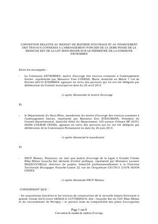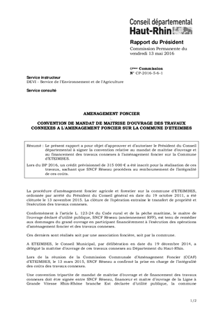 Le présent rapport a pour objet d’approuver et d’autoriser le Président du Conseil départemental à signer la convention relative au mandat de maîtrise d’ouvrage et au financement des travaux connexes à l’aménagement foncier sur la Commune d’ETEIMBES. Lors du BP 2016, un crédit prévisionnel de 315 000 € a été inscrit pour la réalisation de ces travaux, sachant que SNCF Réseau procédera au remboursement de l’intégralité de ces coûts.