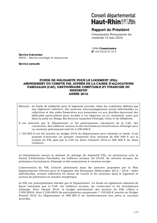 FONDS DE SOLIDARITE POUR LE LOGEMENT (FSL) ABONDEMENT DU COMPTE FSL AUPRÈS DE LA CAISSE D'ALLOCATIONS FAMILIALES (CAF), GESTIONNAIRE COMPTABLE ET FINANCIER DU DISPOSITIF ANNÉE 2016