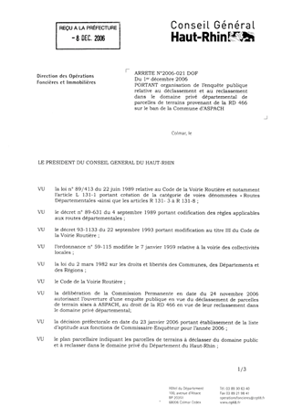 portant organisation de l'enquête publique relative au déclassement et au reclassement dans le domaine privé départemental de parcelles de terrains provenant de la RD 466 sur le ban de la commune d'ASPACH. Resumé Pièces jointes ARRETE Assemblée : Non défini Date : 01/12/2006 Rapporteur : Non défini Collectivité : Conseil départemental du Haut-Rhin Direction : Non défini Service : Service du Patrimoine et du droit des Sols Domaine : Déclassement de voirie Commission :