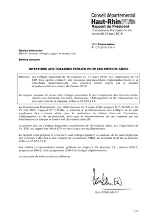 Les collèges disposent de 36 contrats au 31 mars 2016, soit l’équivalent de 18 ETP. Ces agents réalisent des missions qui incombent réglementairement à la collectivité départementale. Ces contrats seront repris par le Conseil départemental au courant de l’année 2016. Le rapport propose de verser aux collèges concernés la part employeur des contrats aidés, relatifs aux fonctions d’accueil, d’entretien, d’hébergement et de restauration. Le montant total de la dépense s’élève à 55 655,72 €.