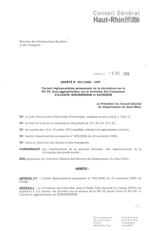 portant réglementation permanente de la circulation sur la RD 55, hors agglomération, sur le territoire des communes d'ILLZACH, KINGERSHEIM et SAUSHEIM. Resumé Pièces jointes ARRETE Assemblée : Non défini Date : 05/12/2006 Rapporteur : Non défini Collectivité : Conseil départemental du Haut-Rhin Direction : Non défini Service : Direction des Routes Domaine : Circulation Commission :