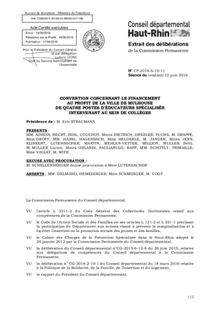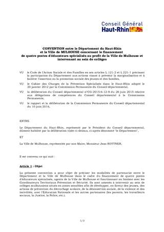 CONVENTION CONCERNANT LE FINANCEMENT AU PROFIT DE LA VILLE DE MULHOUSE DE QUATRE POSTES D'ÉDUCATEURS SPÉCIALISÉSINTERVENANT AU SEIN DE COLLÈGES